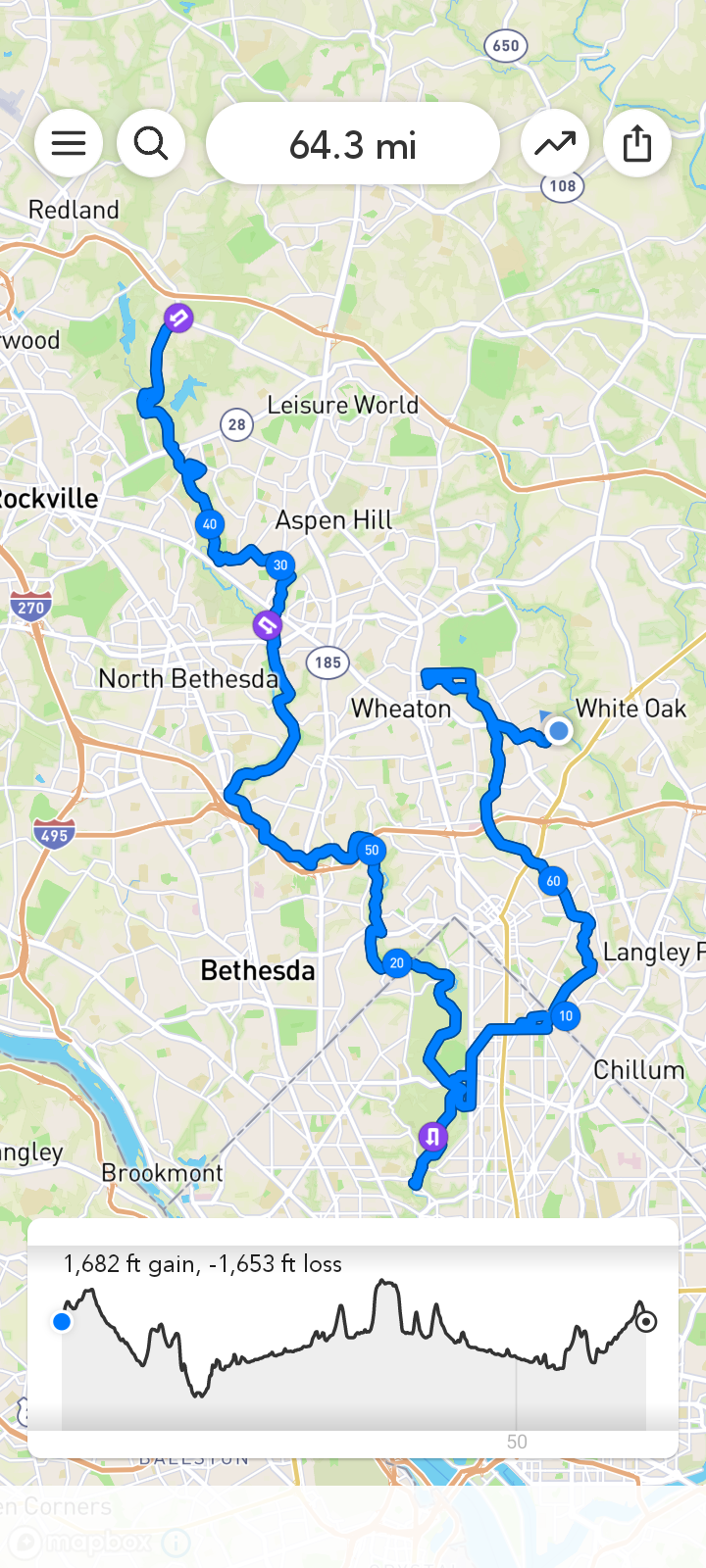 Some people underestimate the downhills. Maple Avenue in Takoma Park has 5-mile-per-hour speed bumps for its entire length and ends with a traffic light. It takes a lot of concentration and control to get down, not an easy feat when you’re exhausted. I was thankful I was able to hold on and manage the bumps in the road.